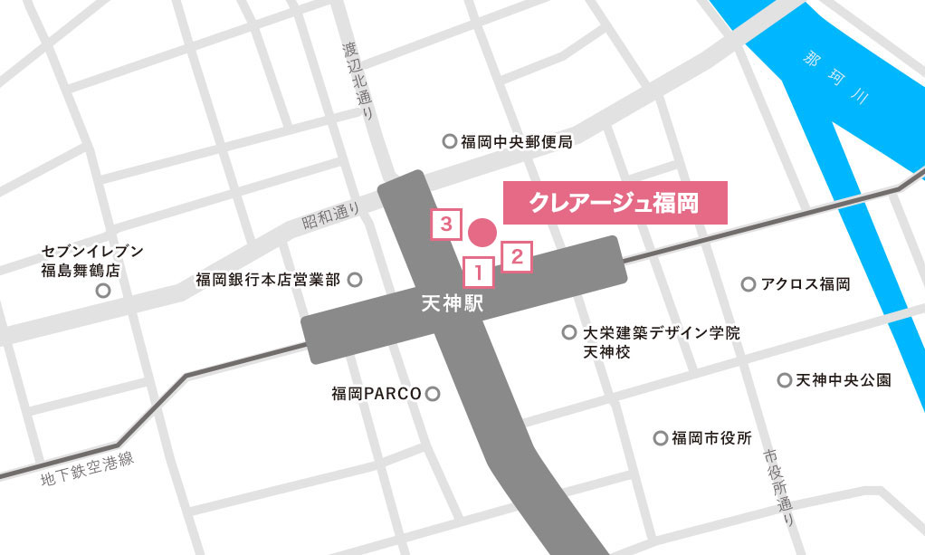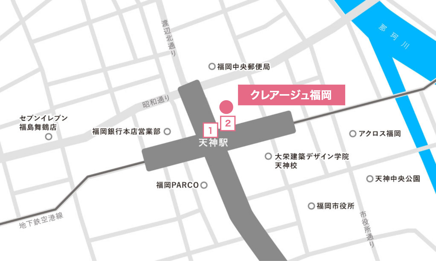 クレアージュ福岡は天神駅から徒歩1分の場所にあります。九州一の繁華街ともいえる天神エリアの駅前に位置しているため通いやすく、施術前にはお買い物やカフェなどを楽しむこともできます。また、基本的にアートメイクは複数回に分けて施術を行うため、アクセスの良さはクリニックを選ぶ上でも重要なポイントとなります。当院では3回に分けて施術を行うため最低でも3回の通院が必要ですが、アクセス抜群のため通院に抵抗はなくなるでしょう。