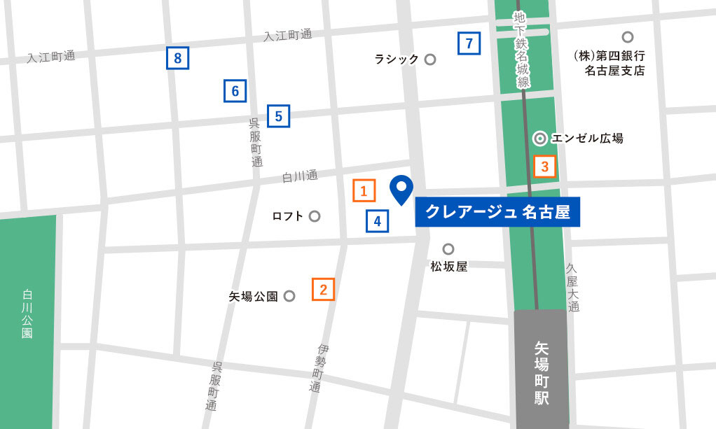 地下鉄東山線・名城線、名鉄瀬戸線『栄駅』をご利用の場合は、7番出口より大津通りを矢場町通り方面(南に下る)に直進し徒歩5分、松坂屋本店の向かいにある、1Fにアップルストアが入っているビルになります。