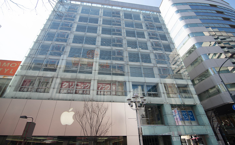 2.そのまま直進すると、1Fにアップルストアが入っているビルが見えてまいります。そのビルが当院が入っている『エフエックスビル』になります。
